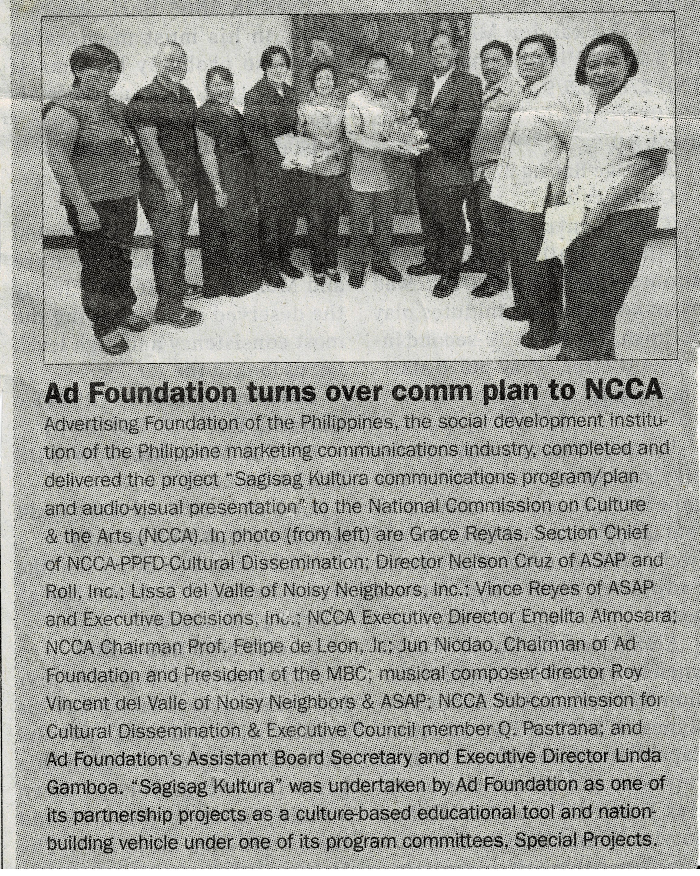 Advertising Foundation of the Philippines, the social development institution of the Philippine marketing communications industry, completed and delivered the project "Sagisag Kultura communications program/plan and audio-visual presentation" to the National Commission on Culture & the Arts (NCCA), In photo (from left) are Grace Reytas. Section Chief of NCCA-PPFD- Cultural Dissemination; Director Nelson Cruz of ASAP and Roll, Inc.; Lissa del Valle of Noisy Neighbors, Inc.; Vince Reyes of ASAP and Executive Decisions, Inc.; NCCA Executive Director Emelita Almosara; NCCA Chairman Prof. Felipe de Leon, Jr., Jun Nicdao, Chaiman of Ad Foundation and President of the MBC), musical composer-director Roy Vincent del Valle of Noisy Neighbors & ASAP; NCCA Sub-commission for Cultural Dissemination & Executive Council member Q. Pastrana; and Ad Foundation's Assistant Board Secretary and Executive Director Linda Gamboa. “Sagisag Kultura" was undertaken by Ad Foundation as one of its partnership projects as a culture-based educational tool and nation building vehicle under one of its program committees, Special Projects.